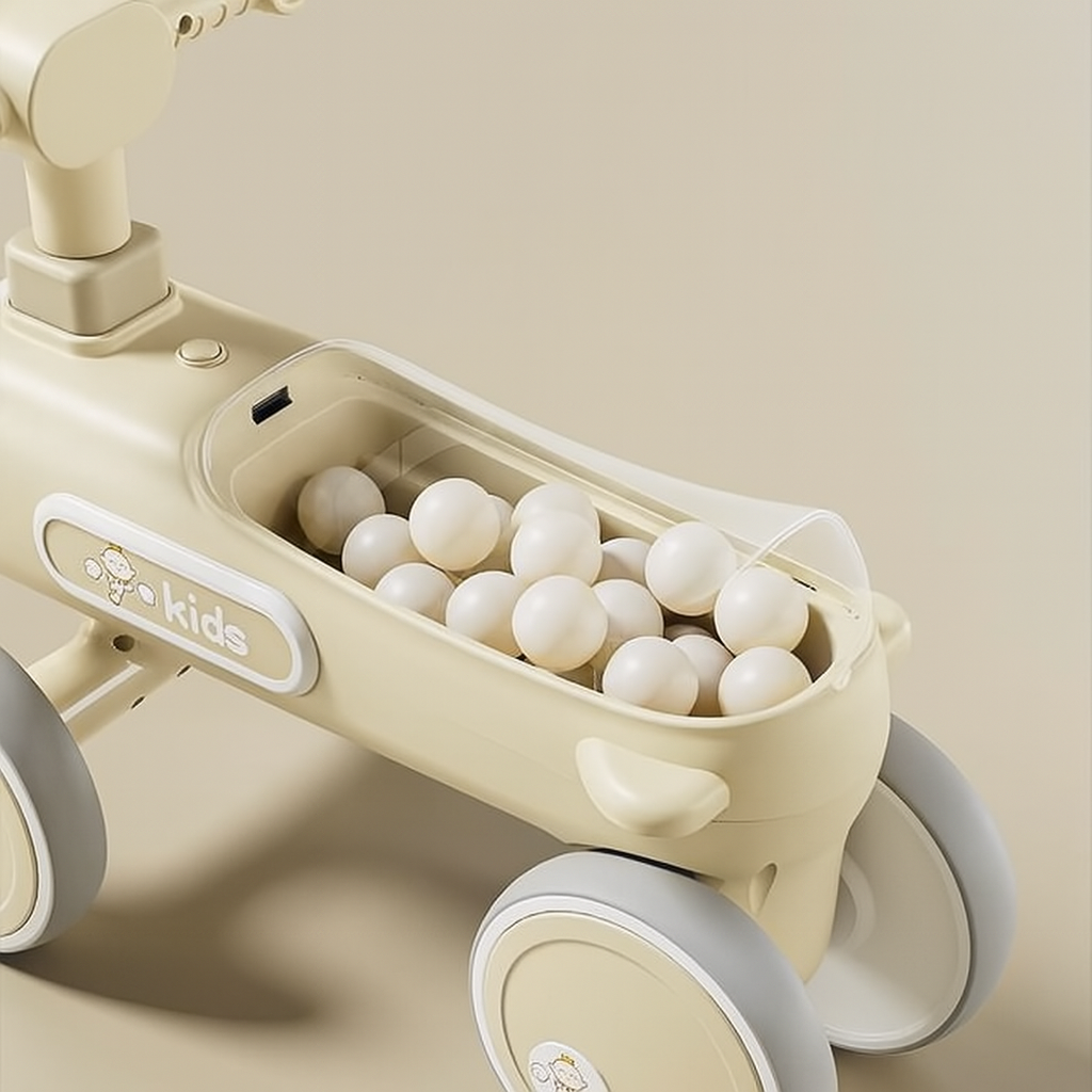 Den fyrhjuliga designen ger hög stabilitet, vilket gör den till ett utmärkt val som första sparkbil. Barnet kan enkelt ta sig fram med hjälp av sina egna ben och samtidigt träna balans, koordination och motorik. Perfekt för inomhusbruk eller plana ytor utomhus.