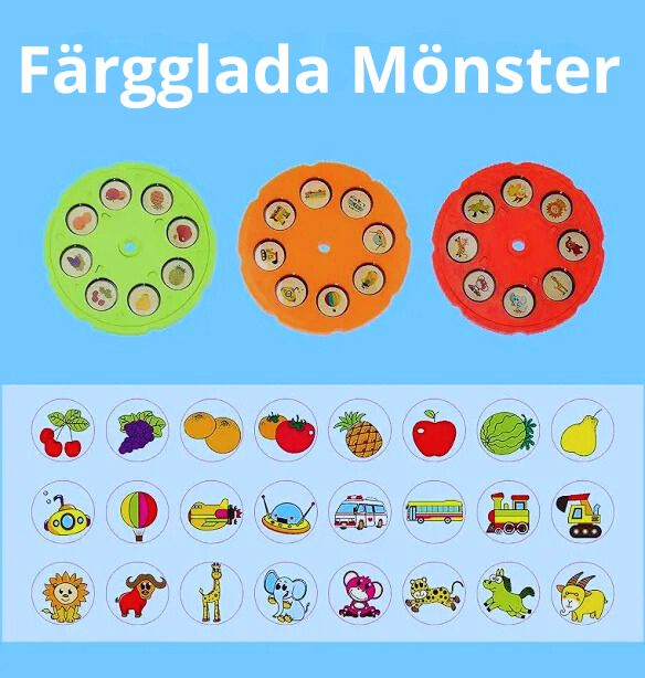 Setet innehåller ett bord med projektor, 3 mönsterskivor, ett sudd, ett ritblock samt 12 färgpennor. Allt ditt barn behöver för att börja skapa direkt!