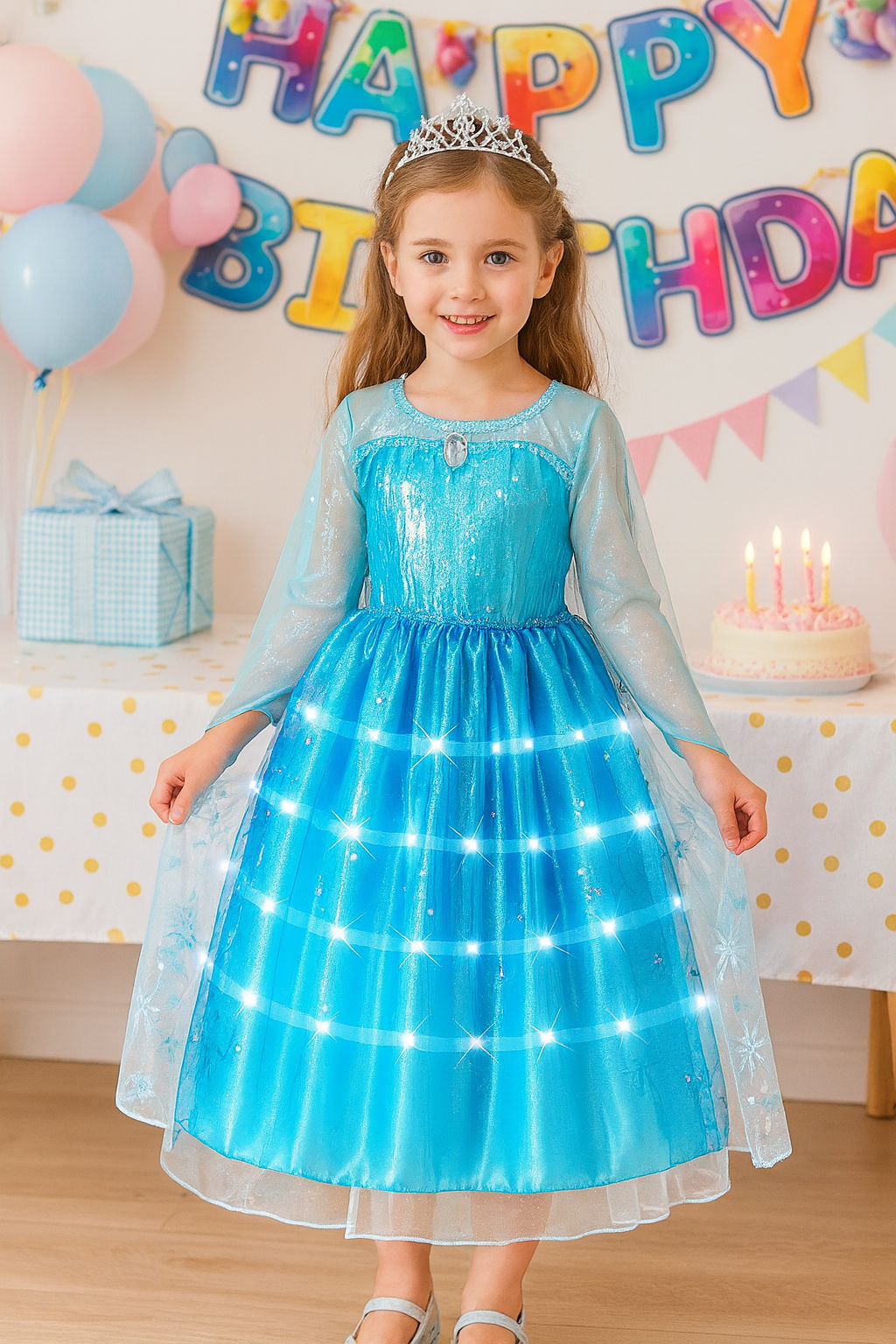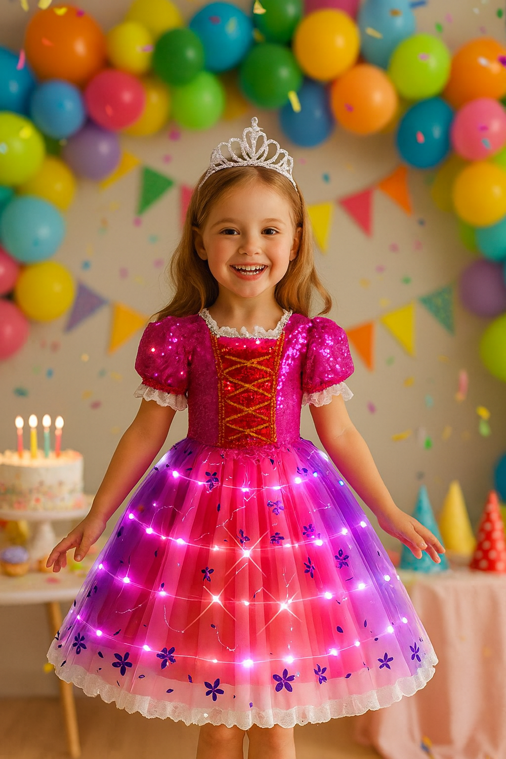 Låt din lilla prinsessa glänsa! Den här sagoklänning med LED är perfekt för maskerad, fester, födelsedagar, skolavslutningar eller lekfulla dagar där magin får ta plats.