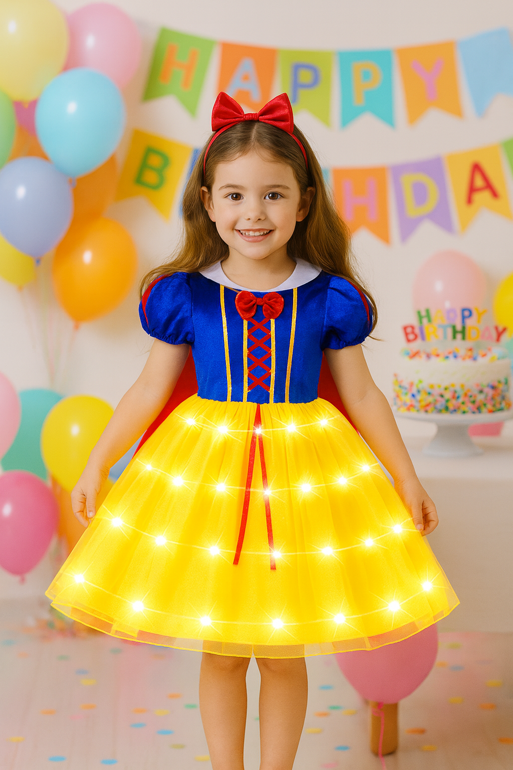 Låt ditt barn kliva in i en sagovärld med denna färgglada sagoklänning som lyser upp med vackra LED-lampor! Perfekt för kalas, maskerader, halloween, barnens dag eller när som helst barnet vill känna sig som en riktig prinsessa.