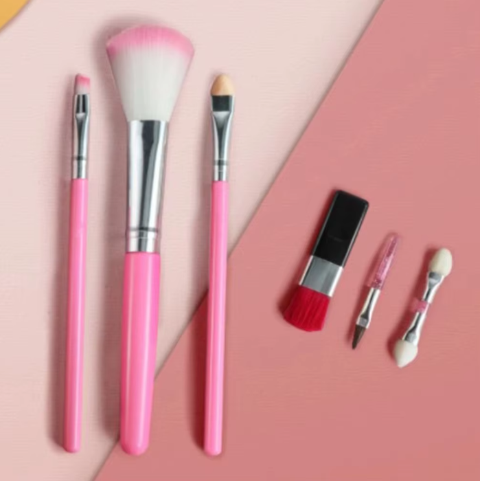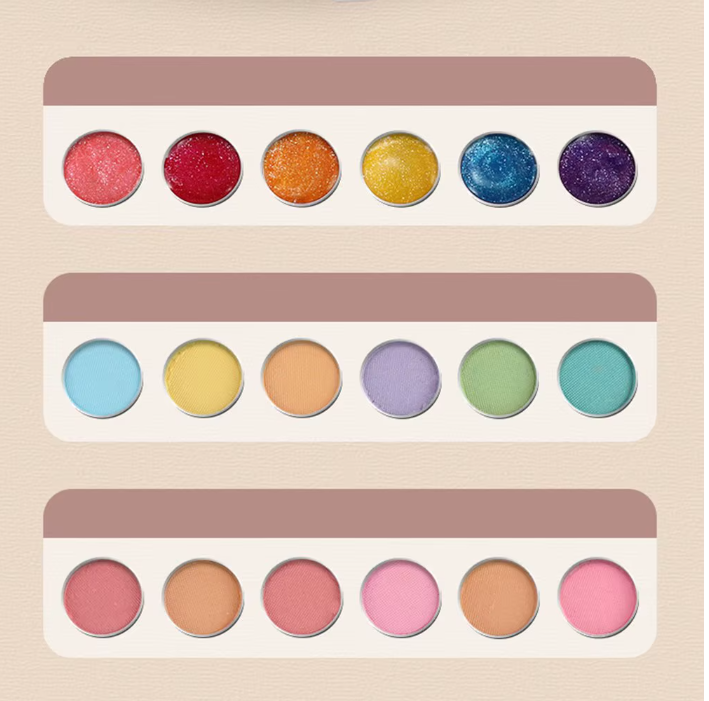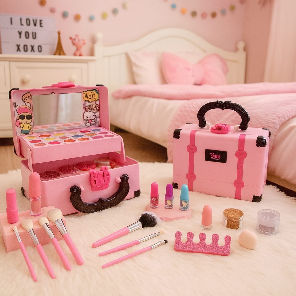 Innehåller ögonskuggor, läppglans, läppstift, rouge, puder, nagellack, ögonbrynspensel samt en praktisk sminkväska med handtag – perfekt för små händer att bära runt.