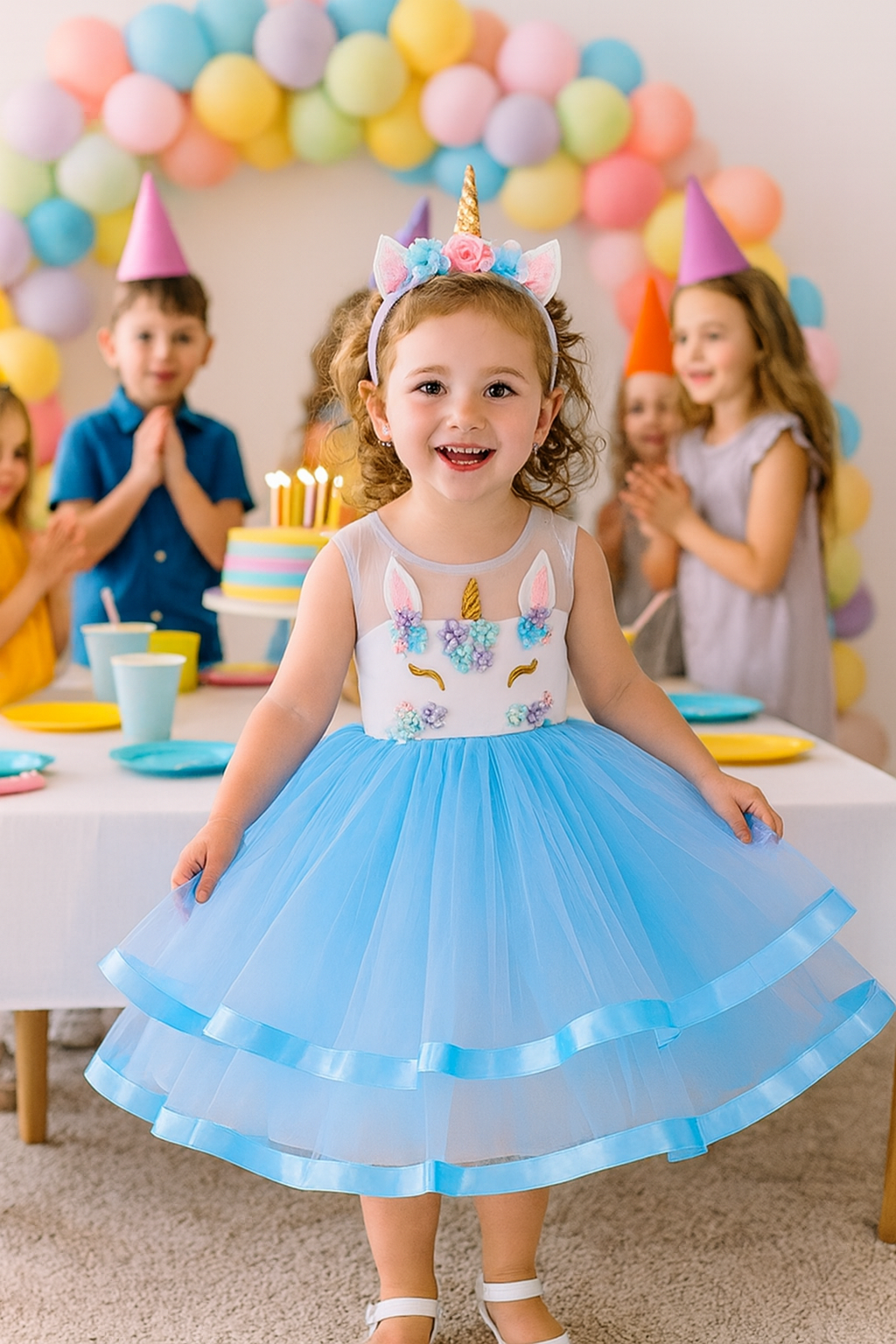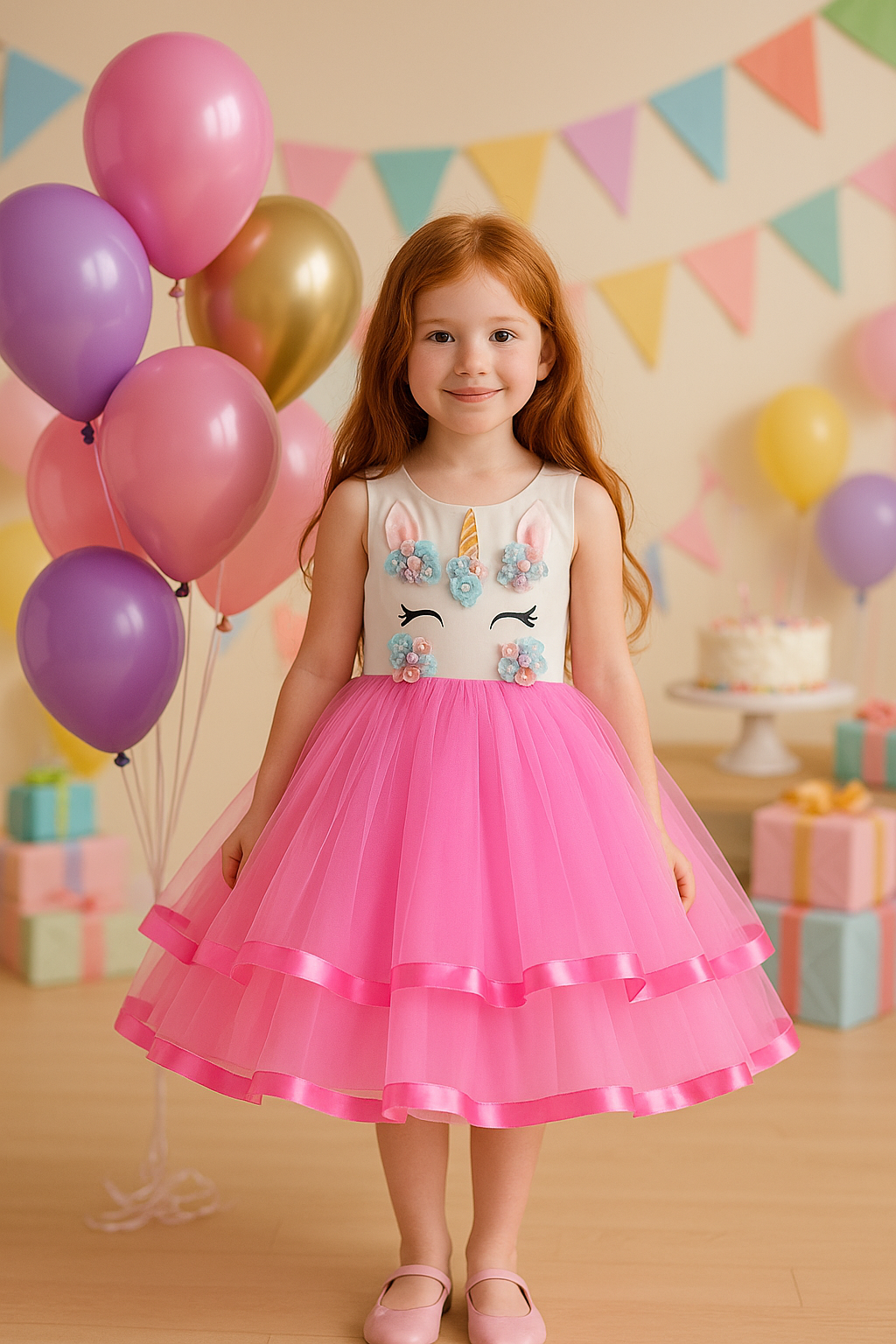 Gör varje dag till en magisk dag med vår Unicorn Klänning för flickor – den perfekta klänningen för kalas, fotografering, maskerad eller bara en extra glittrig dag hemma!